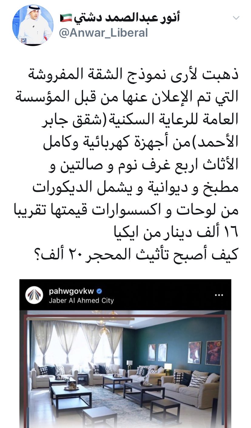 برق نيوز A Twitter أنور دشتي مغردا ذهبت لأرى نموذج الشقة المفروشة التي تم الإعلان عنها من قبل المؤسسة العامة للرعاية السكنية شقق جابر الأحمد من أجهزة كهربائية وكامل الأثاث اربع غرف نوم