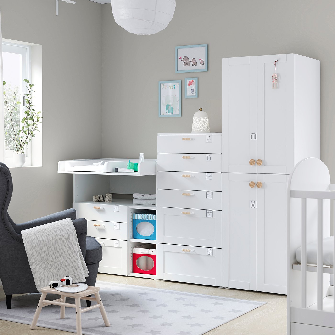 Smastad Platsa تشكيلة تخزين أبيض مع إطار مع طاولة تغيير Ikea